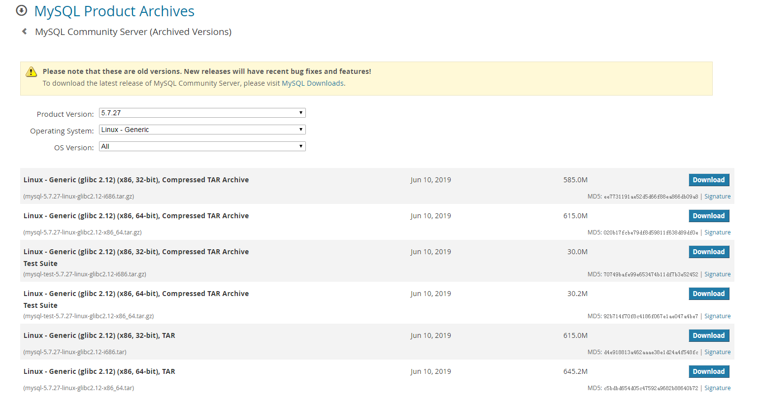If your MySQL version is 5.7.27, download the following software packages: