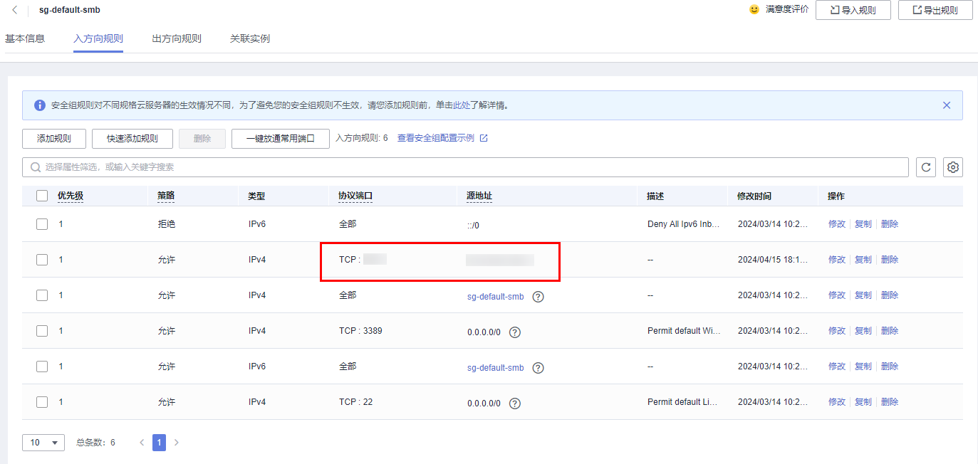 - 使用弹性公网IP连接数据库实例时,必须要将弹性公网IP和端口加入安全组“sg-default-smb”的入方向规则。具体操作,请参见添加安全组规则。