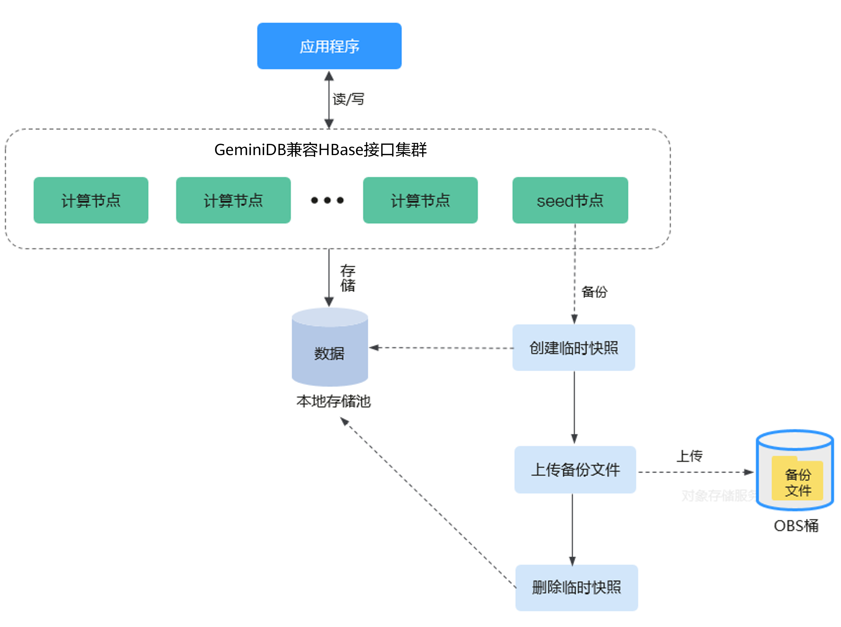 GeminiDB HBase接口有专门负责备份管理的节点(seed节点)。如图1 备份原理所示,GeminiDB HBase接口的备份在seed节点上进行,通过对数据进行秒级快照,并将生成的备份文件以压缩包的形式存储在对象存储服务(OBS)中,不会额外占据GeminiDB HBase接口实例的存储空间。备份上传过程中会消耗一定的CPU,因此会存在CPU上涨的现象,一般涨幅范围在5%~15%,该现象属于正常现象。