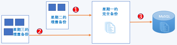 恢复到多次增量备份后的时间点需要按照时间先后顺序把所有增量备份时间点的数据块应用到完全备份数据中,最后将完全备份数据恢复到MySQL数据目录,启动数据库服务。