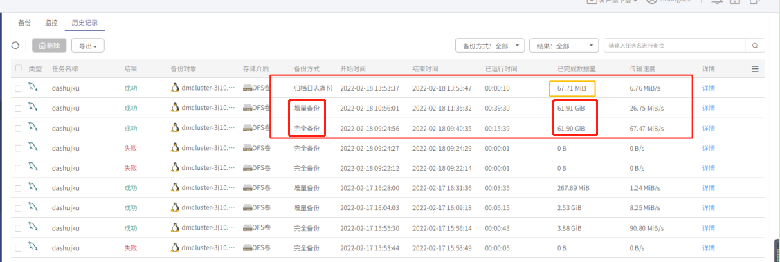 混合云备份2.0-A完成物理备份完全备份后可以发起增量备份,任务发起时: