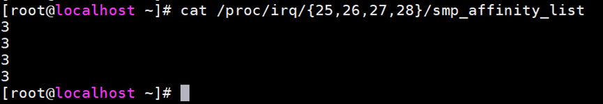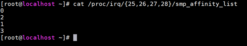 执行cat /proc/irq/{25,26,27,28}/smp_affinity_list进行查看,显示已设置成功