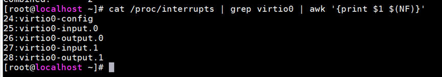 cat /proc/interrupts | grep virtio0 | awk '{print $1 $(NF)}'