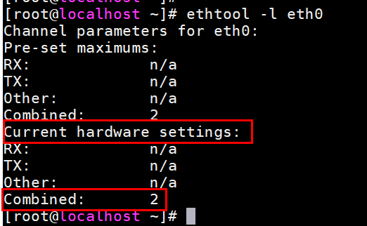 - 执行ethtool -l eth0查看网卡硬件队列数,本例中有两个网卡队列