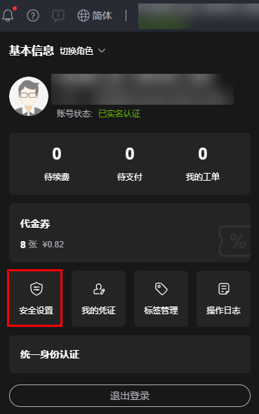 - 在“控制台”页面,鼠标移动至右上方的用户名,在下拉列表中选择“安全设置”。