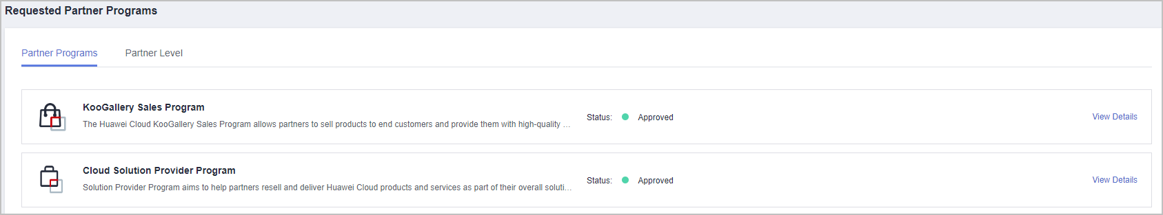 - Click View Details on the Partner Programs tab page to view the details about a requested partner program such as status and information required for application.