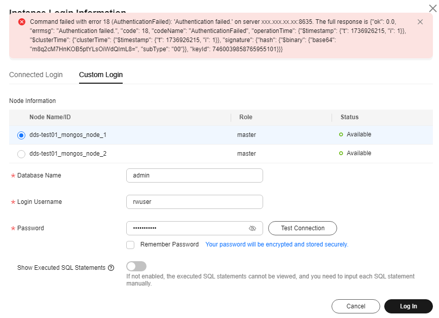 1. If the following error information is displayed when you log in to a DDS instance through DAS, rectify the fault by referring to What Should I Do If I Fail to Connect to a DDS Instance?