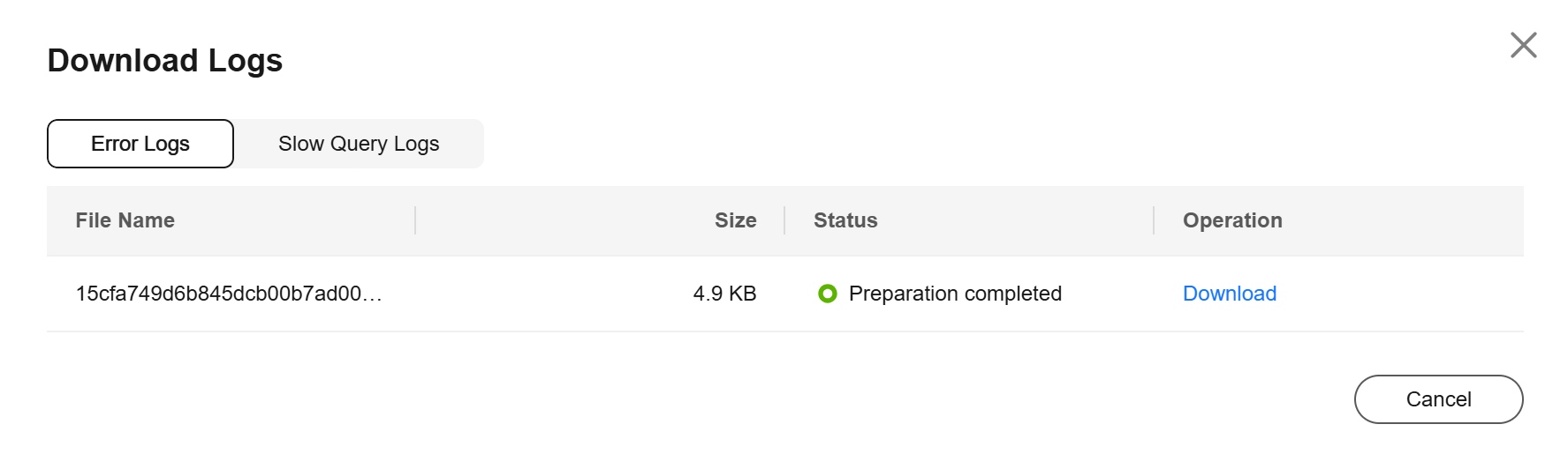 3. Locate the log file whose status is Preparation completed and click Download in the Operation column.