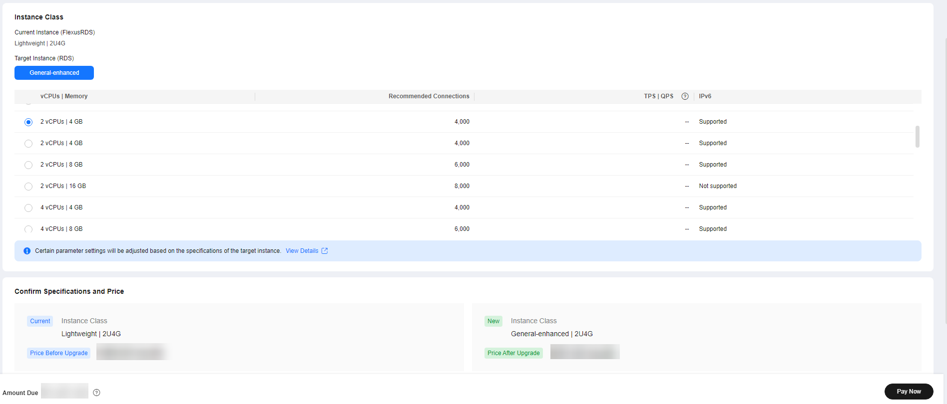 - When a FlexusRDS for MySQL instance is being upgraded to an RDS instance, the following operations cannot be performed on the instance: deleting the instance, rebooting the instance, modifying the parameter template, or creating backups.