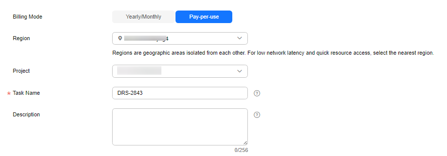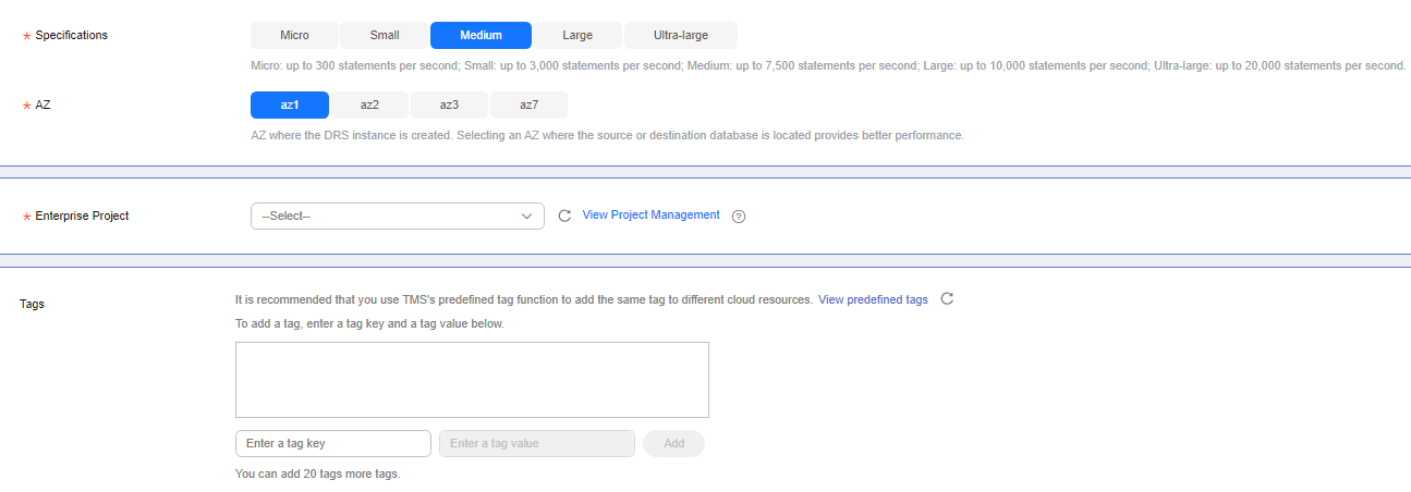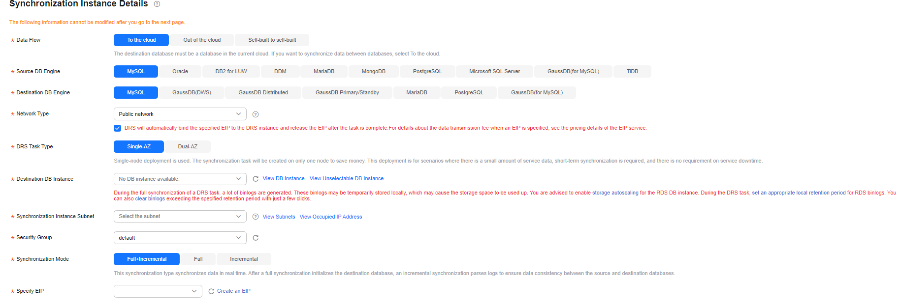 - Configure synchronization instance details. Specifically, specify Data Flow, Source DB Engine, Destination DB Engine, Network Type, DRS Task Type, Destination DB Instance, Synchronization Instance Subnet, Synchronization Mode, Specify EIP (mandatory when Network Type is set to Public Network), Specifications, AZ, Enterprise Project, and Tags (optional).