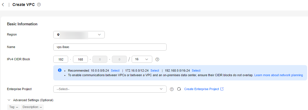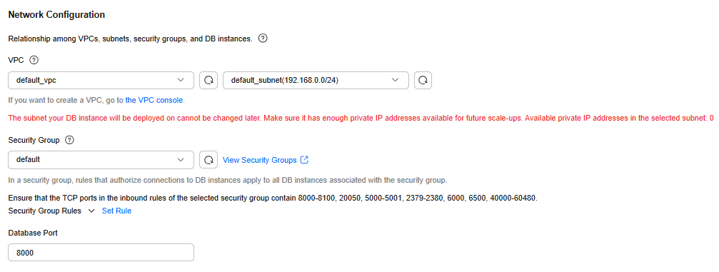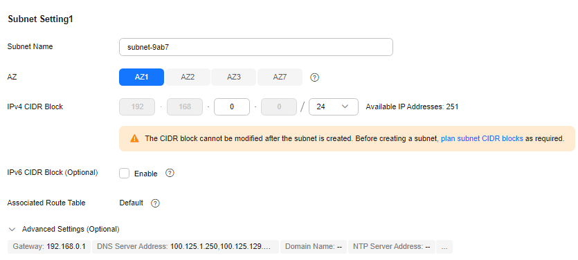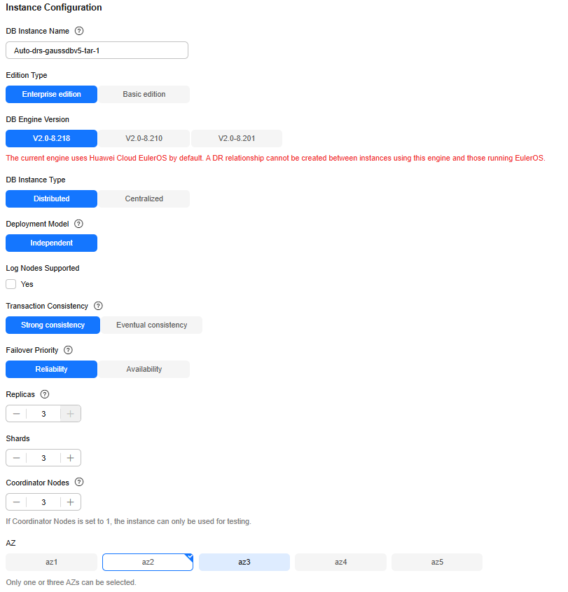 In this example, a single AZ is selected. You are advised to select multiple AZs to improve instance availability in actual use. |