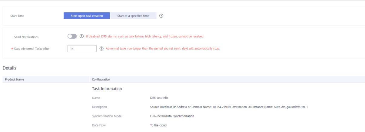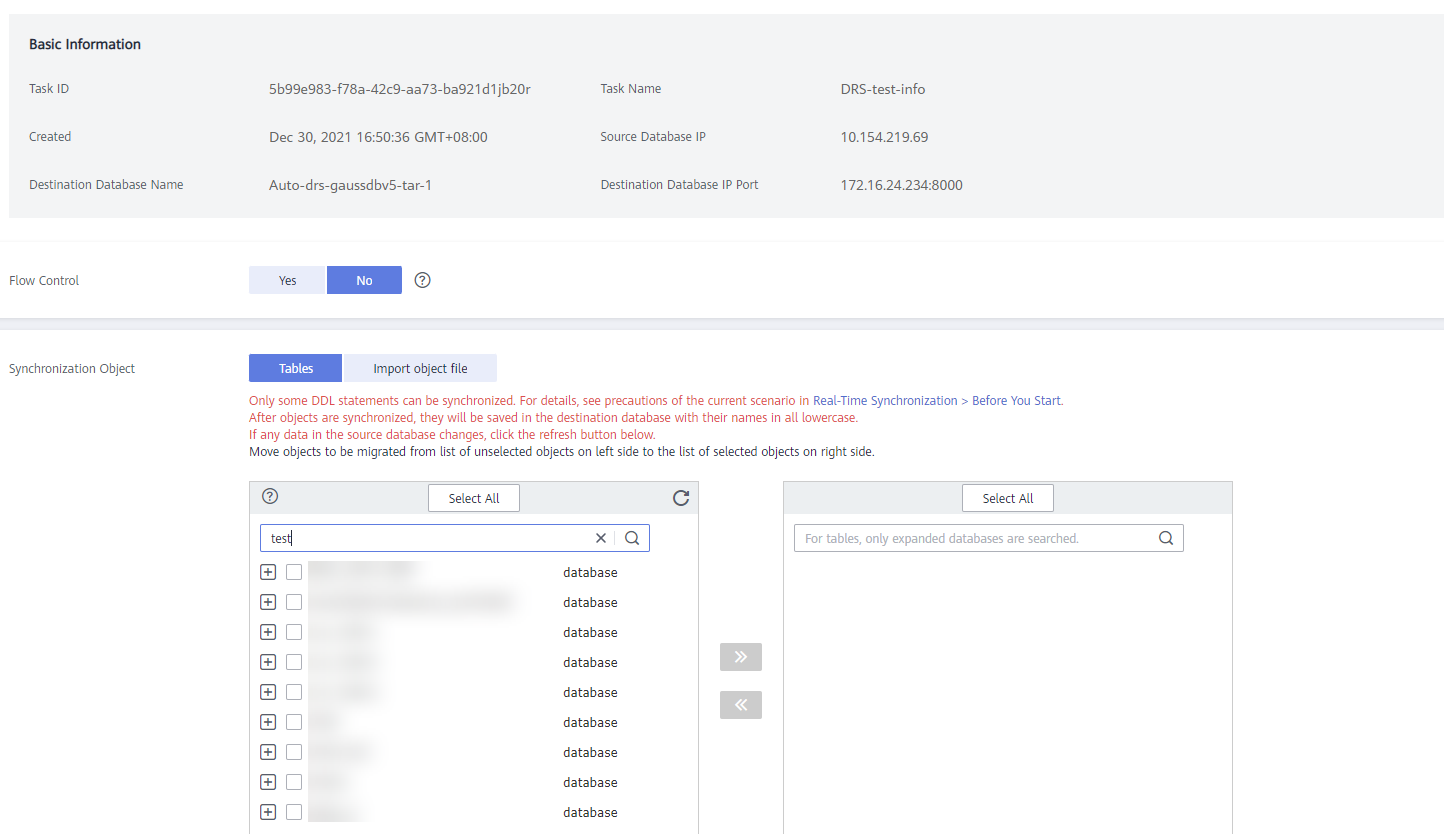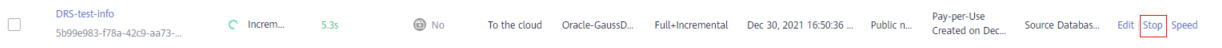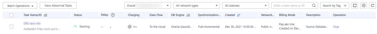 Create a DRS instance and migrate data from the test_info database in the on-premises Oracle database to the test_database_info database in the GaussDB instance.