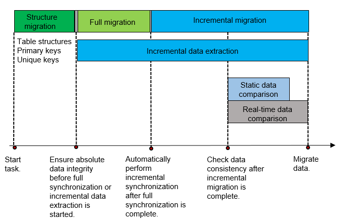 The data migration process is completed using full and incremental synchronization, which includes the following operations: