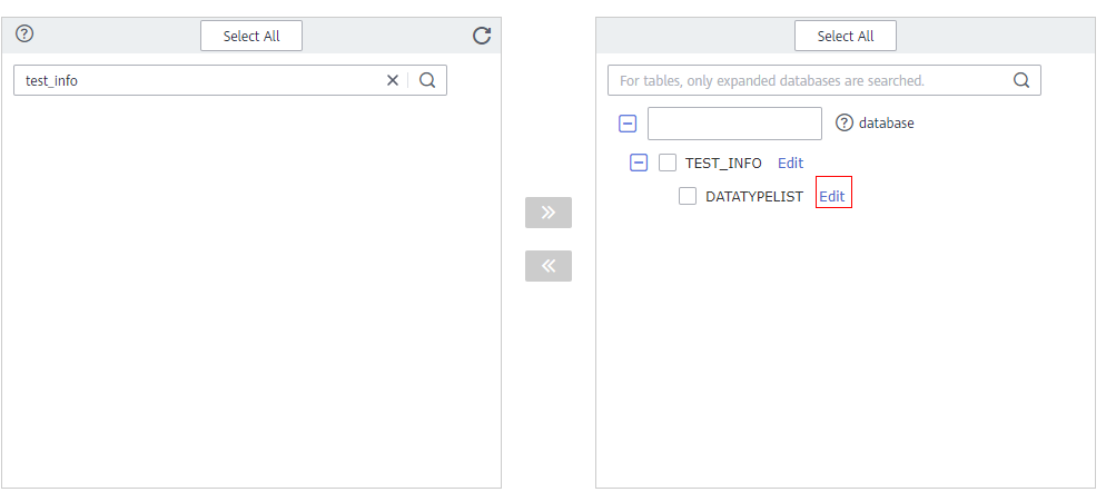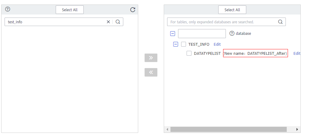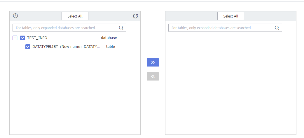 - Select the databases and tables of the source database to be migrated. In this example, select the DATATYPELIST table from the test_info database.