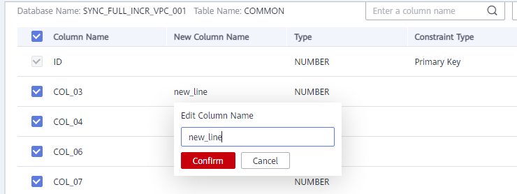 On this page, you can process the table to be migrated. For example, you can select the column to be migrated and change its name. In this example, change the column name COL_01_CHAR______E to new-line.