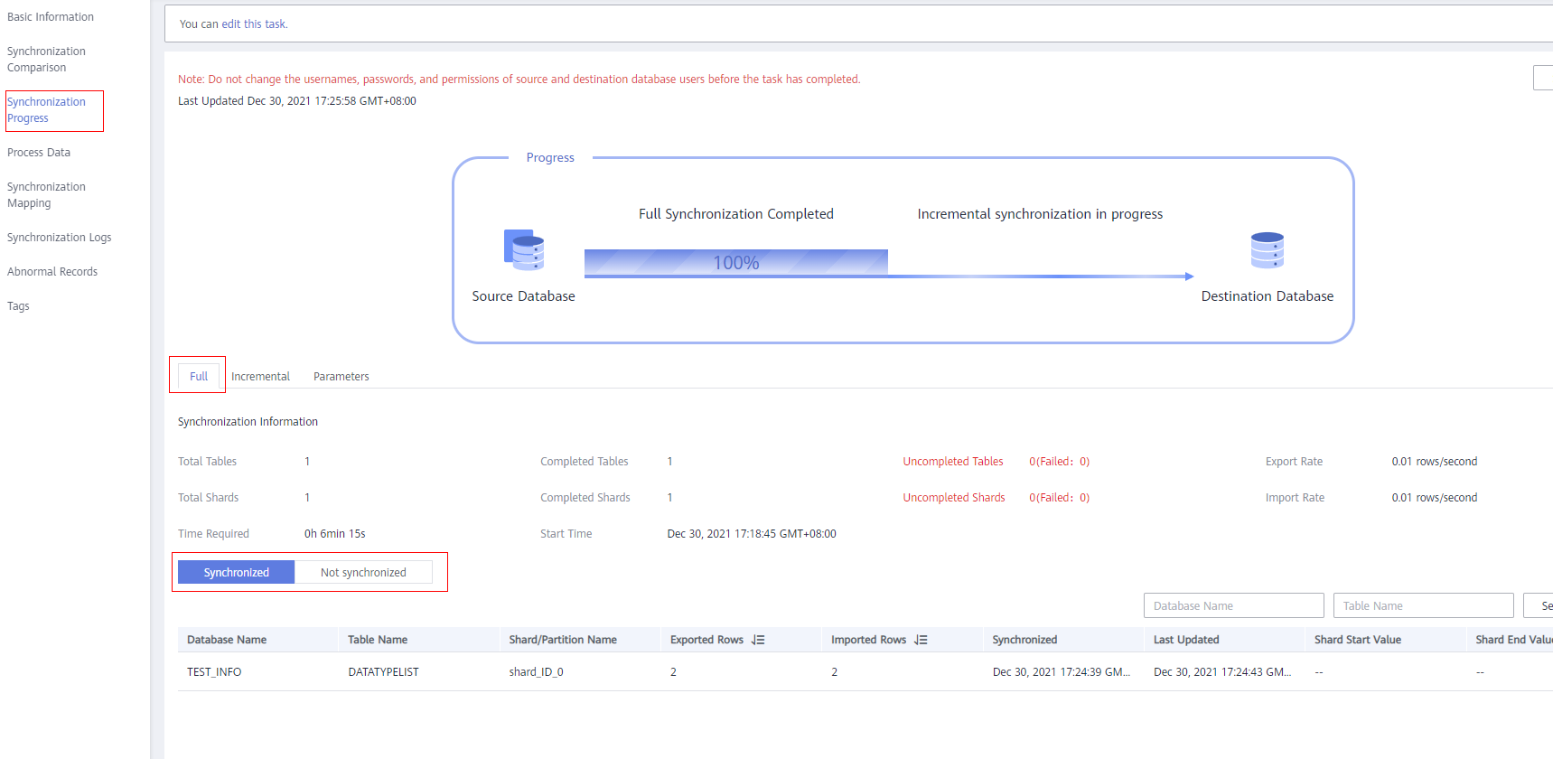 - An incremental synchronization is automatically started after the full migration is complete. The replay starts from the position where the full synchronization starts.