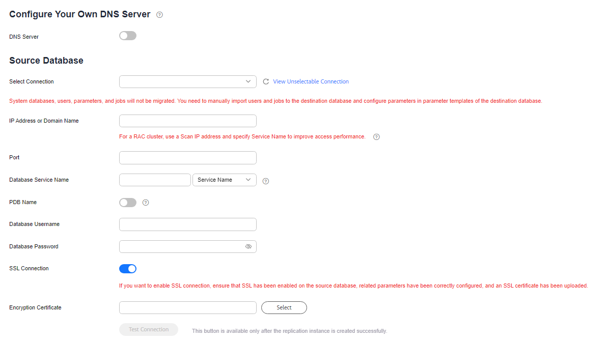 - Configure DNS Server as required. Specify connection information about the source database, including the IP address, port, username, and password.