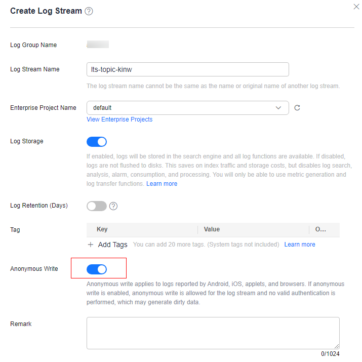 3. Click Create Log Stream. On the page displayed, set the parameters by referring to Table 1 and enable Anonymous Write. This function is applicable to scenarios where devices report logs via SDKs. By enabling it, you grant the log stream permission for anonymous writing, which means no valid authentication will be performed. This may lead to the generation of dirty data.