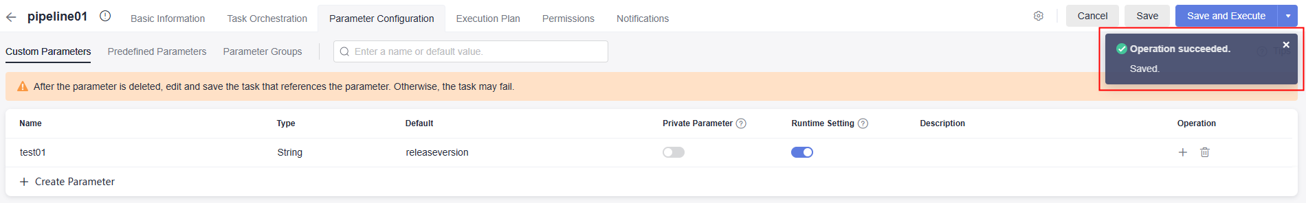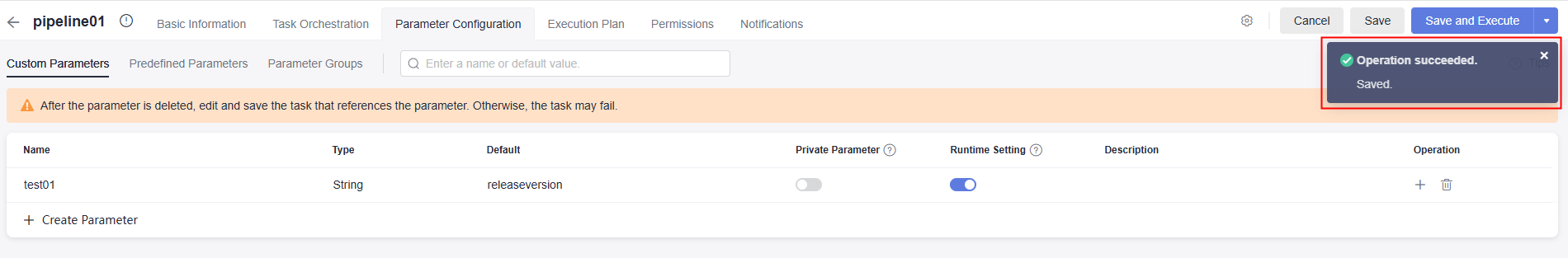 - After the configuration, click Save. A message is displayed, indicating that the pipeline is saved successfully.