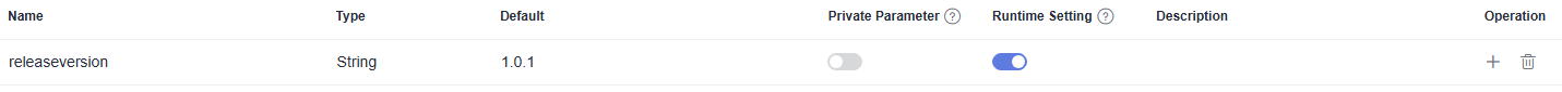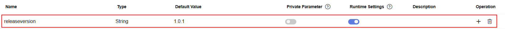- Click the Parameters tab, add the releaseversion parameter, set the default value, and enable Runtime Settings.