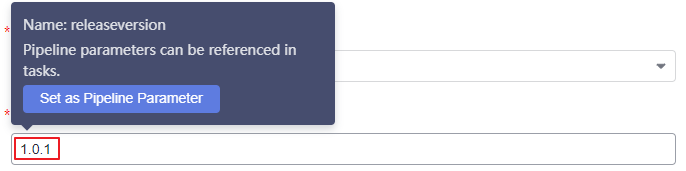 - Move the cursor to the releaseversion parameter and click Set as Pipeline Parameter. Alternatively, click OK, switch to the Parameter Configuration tab page, create the pipeline parameter releaseversion, set Type to Auto-increment or String, set a default value, and enable Runtime Setting.