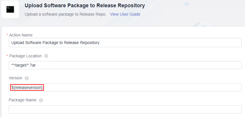 - Click the Build Actions tab. On the displayed page, click Add Action, move the cursor to the Upload to Release Repo card, click Add, and set Version to a reference parameter. After you enter $ in the text box, a parameter list is displayed. Select the releaseversion parameter created in the previous step. $ will not trigger the display of parameter groups.