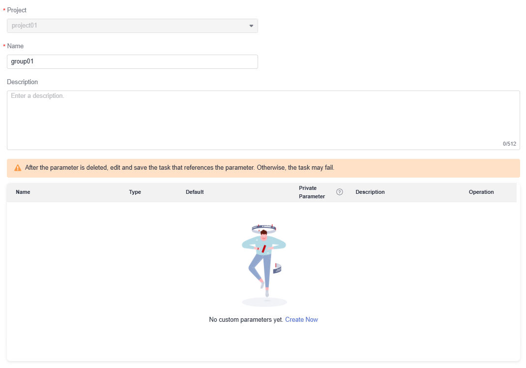 - On the displayed page, click Create Now to configure parameters. If there are custom parameters, click Create Parameter to add a new one.