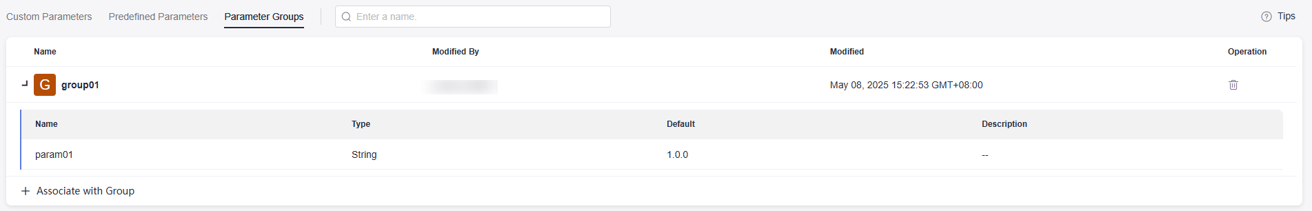 Figure 3 Associating with a parameter group - After the configuration, click Save. A message is displayed, indicating that the operation is successful.