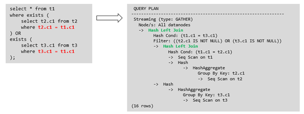 The correlated subquery is displayed in the target list (query return list). Values need to be returned even if the condition t1.c1=t2.c1 is not met. Therefore, use a left outer join to join t1 and t2 so that the SSQ can return padding values when the condition t1.c1=t2.c1 is not met. However, COUNT is used, which requires that 0 is returned when the condition is not met. case-when NULL then 0 else count(*) can be used.