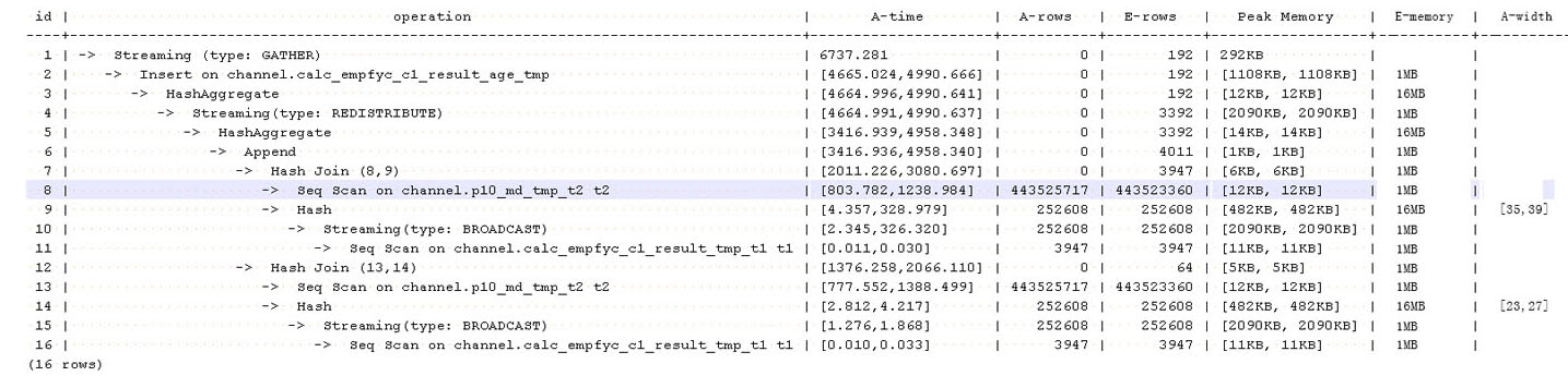 The test result shows that both result sets are too large. As a result, nestloop is time-consuming with more than one hour to return results. Therefore, the key to performance optimization is to eliminate nestloop, using more efficient hashjoin. From the perspective of semantic equivalence, the SQL statements can be written as follows: