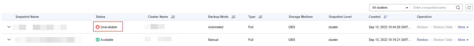 2. Choose Management > Snapshots. Alternatively, in the cluster list, click the name of the target cluster to switch to the Cluster Information page. Then, click Snapshots. All snapshots are displayed by default.