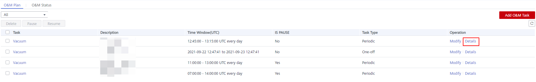 4. In the O&M Plan area, click Details in the Operation column of the target task.