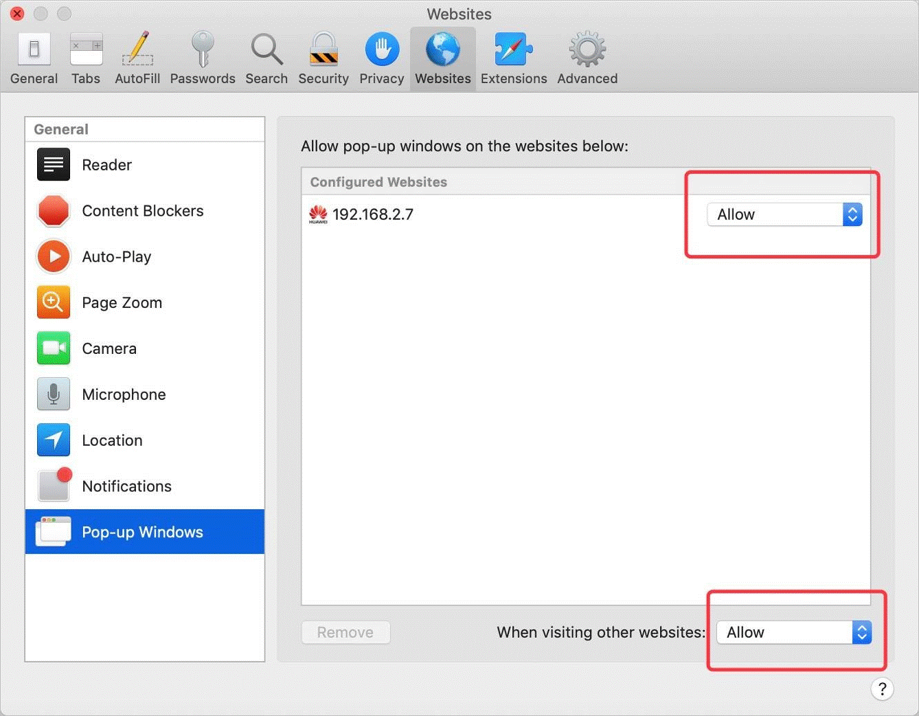 - In the macOS, set the preference of the Safari browser. Choose Websites > Pop-up Windows. Select Allow to allow pop-up windows.
