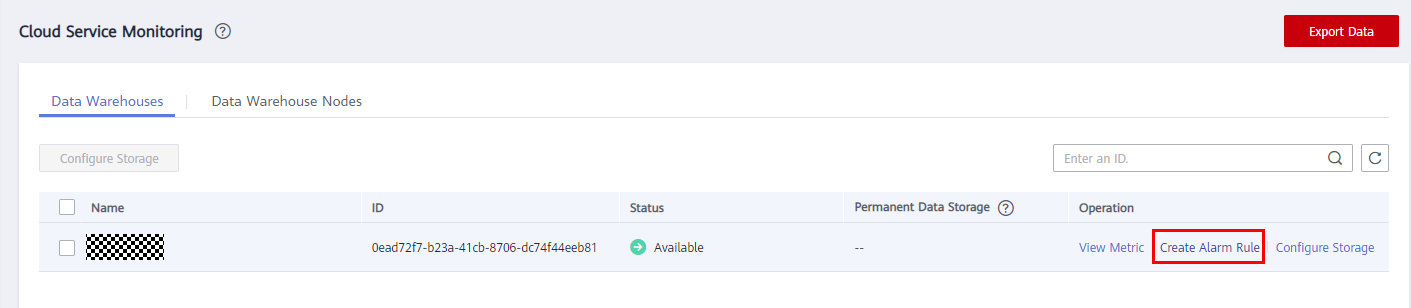 3. Click in the upper left corner on the displayed page and click Create Alarm Rule of the target cluster.