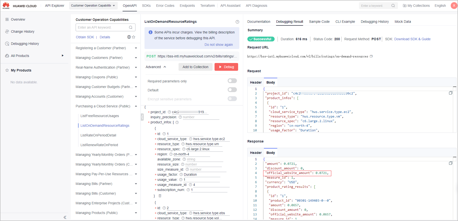- (Optional) Go to API Explorer and add product_infos to the request body. The same results will return as that obtained using the price calculator.