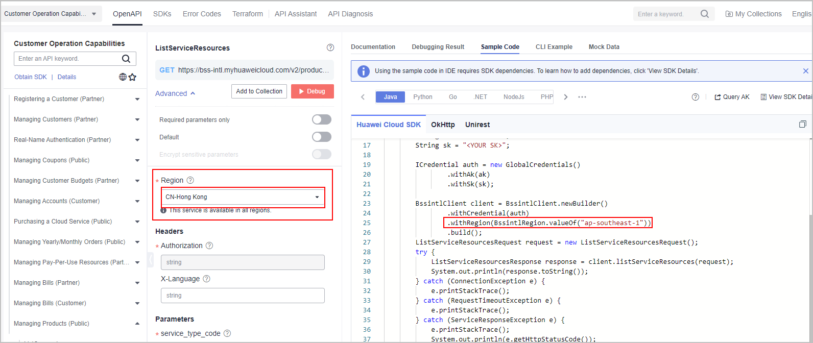 The region of an SDK is a global domain name and cannot be modified. If you modify the region, APIs cannot be debugged. The following figure shows an example in Java.