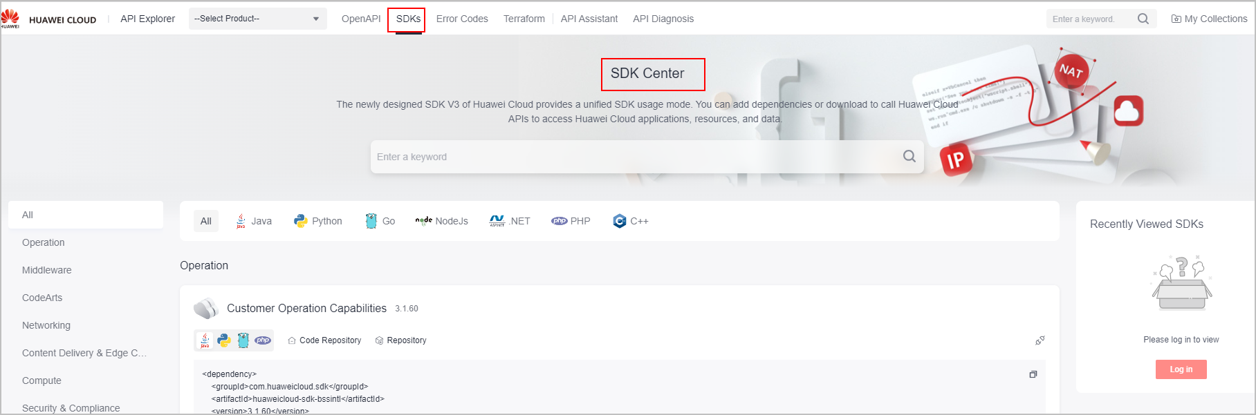 You can select an SDK by service and language in SDK Center. The code repository, NuGet repository, and related APIs are included.