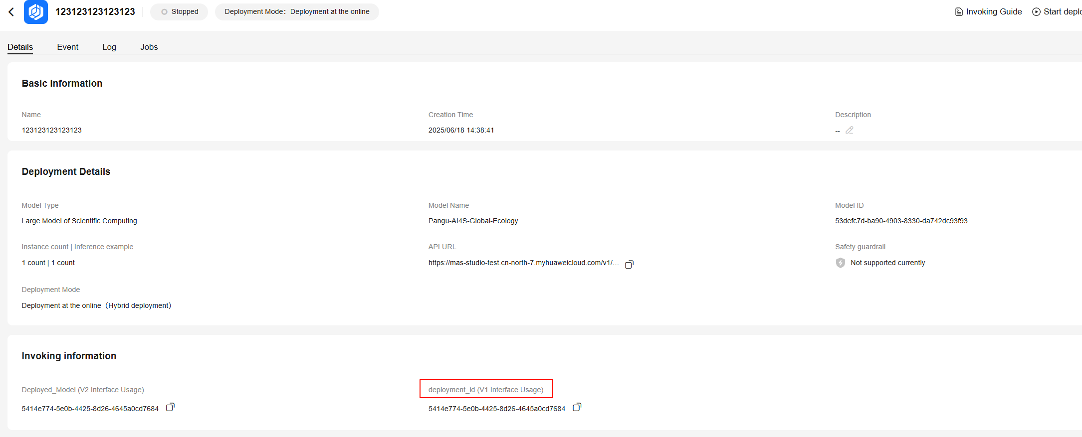 - To call a deployed model, choose Model Development > Model Deployment in the navigation pane on the left. On the My Service tab page, click the model name in the model deployment list. On the Details tab page, obtain the deployment ID of the model.