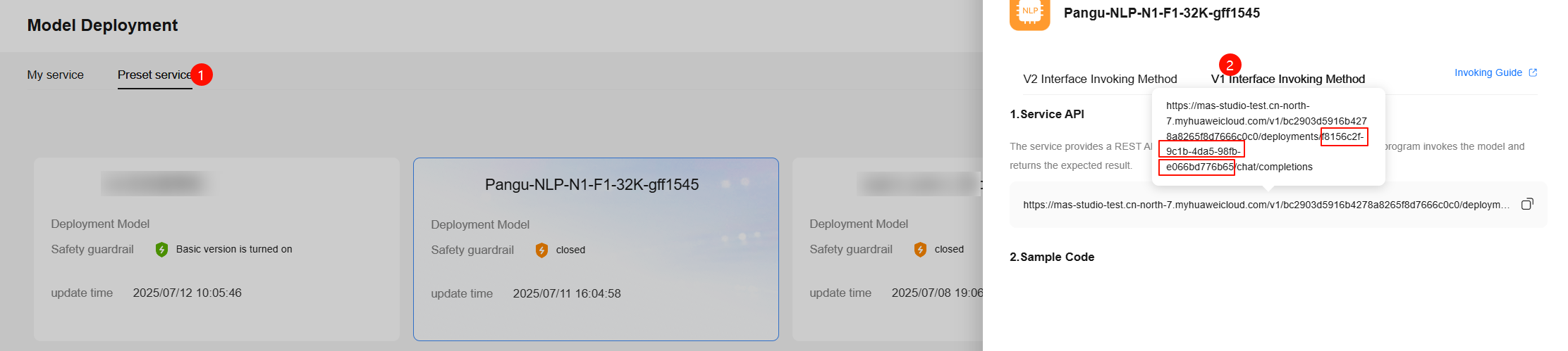 - To call a preset model, choose Model Development > Model Deployment in the navigation pane on the left, click Call Path in the model list on the Preset service page, and obtain the deployment ID of the model.