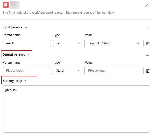 • The responseContent parameter is available by default. The value is the Specify reply content of the workflow's end node.