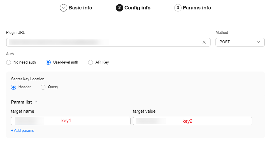 • When the workflow is associated with a plug-in node and the plug-in requires user-level authentication, you need to configure the authentication information. For example, you can set config to {"key2": "value"} for the following plug-in.