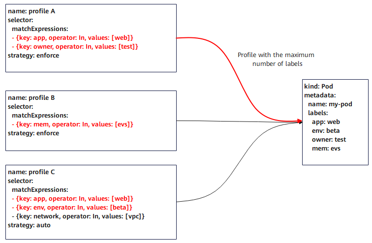 A pod can only have one profile. If a pod has multiple profiles, the profile that can associate the maximum of labels is used. If there are multiple profiles that can associate an equal number of labels, the profile whose name has the smallest alphabetical order is used. In this figure, the pod is finally associated with profile A. |