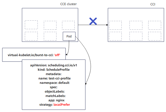- localPrefer: The workload is preferentially scheduled to a CCE cluster. If cluster resources are insufficient, Workloads are elastically scheduled to CCI 2.0.
