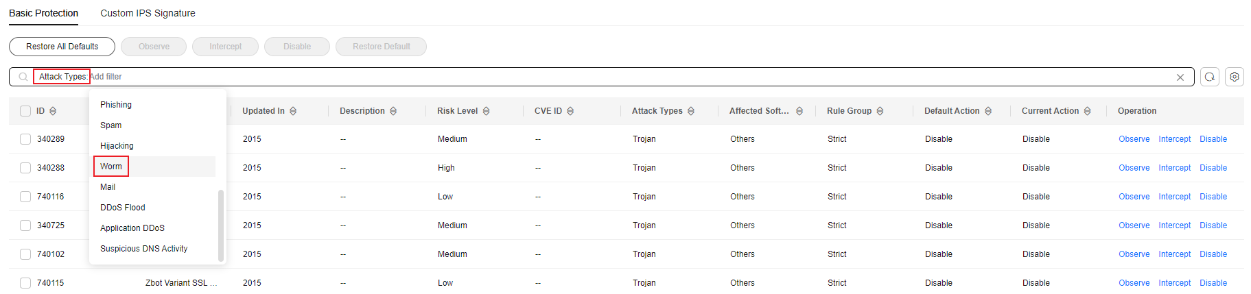 - Filter the rules for defending against worms. In the filter above the list, select Worm from the Attack Types drop-down list.