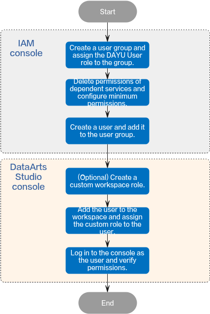 - Grant the DAYU User system role permissions to the IAM account of the data operations engineer, grant the minimum permissions of the dependent services, and then delete the preset permissions of dependent services from the IAM account.