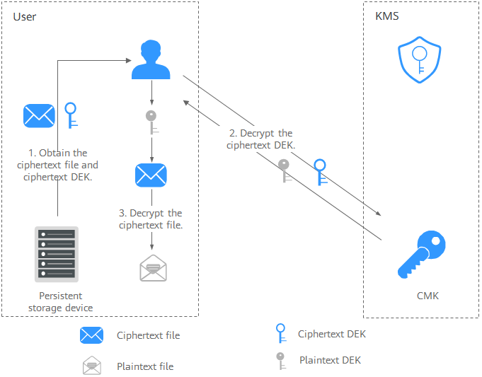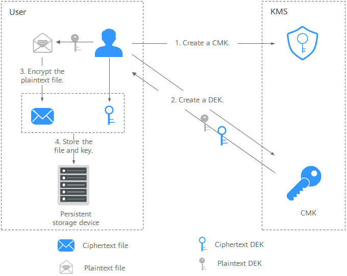 Envelope encryption is a high-performance encryption and decryption solution for massive data. A one-time DEK, which is randomly generated locally, is used to encrypt and decrypt massive data in seconds. The DEK is immediately encrypted by the CMK and stored on the disk. You can call the KMS API to decrypt the DEK ciphertext into plaintext and store the plaintext in the memory. The encryption and decryption performance is close to that of the local AES. The key is securely managed in the KMS.