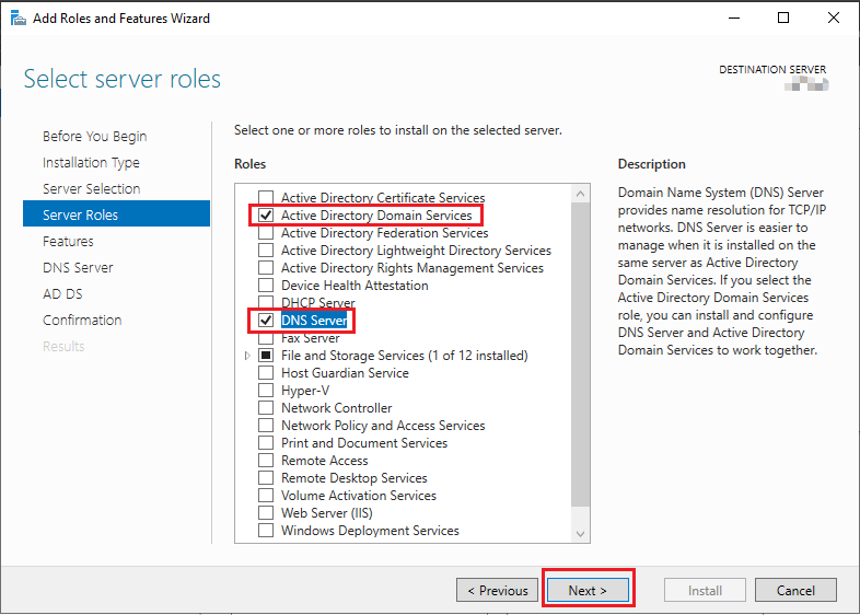 - Select roles Active Directory Domain Services and DNS Server, and click Next.