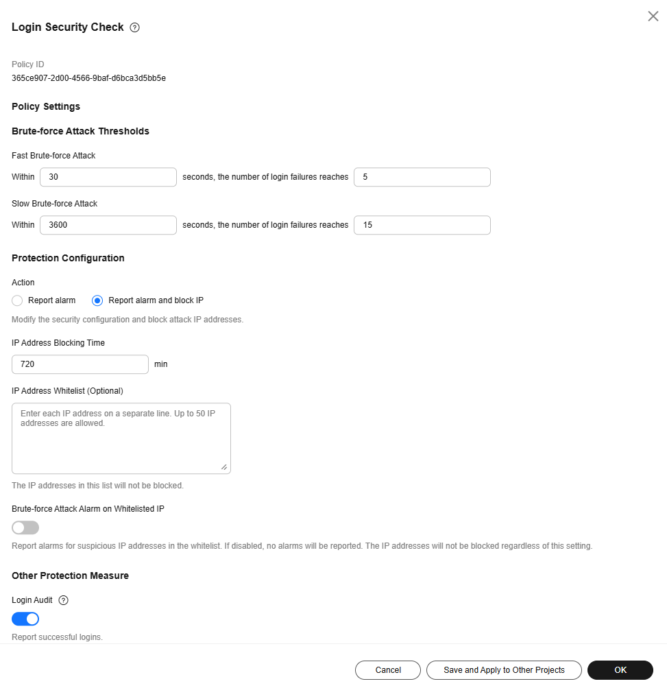 After login security detection policy is configured, you can enable login security check for the target server. HSS will effectively detect brute force attacks, automatically block brute force IP addresses, and trigger and report alarms.