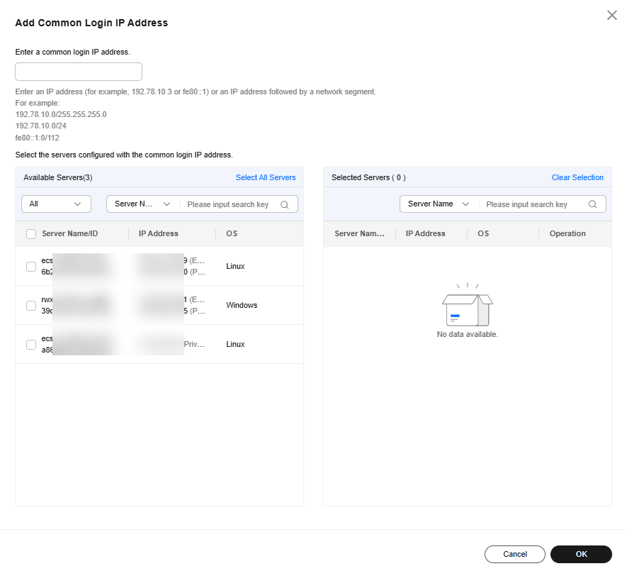 - In the dialog box that is displayed, enter a common login IP address and select servers. Confirm the information and click OK.