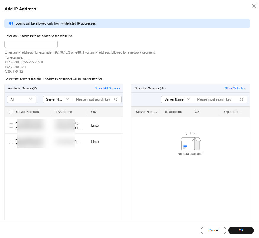 - In the dialog box that is displayed, enter an IP address to be added to the whitelist and select servers. Confirm the information and click OK.